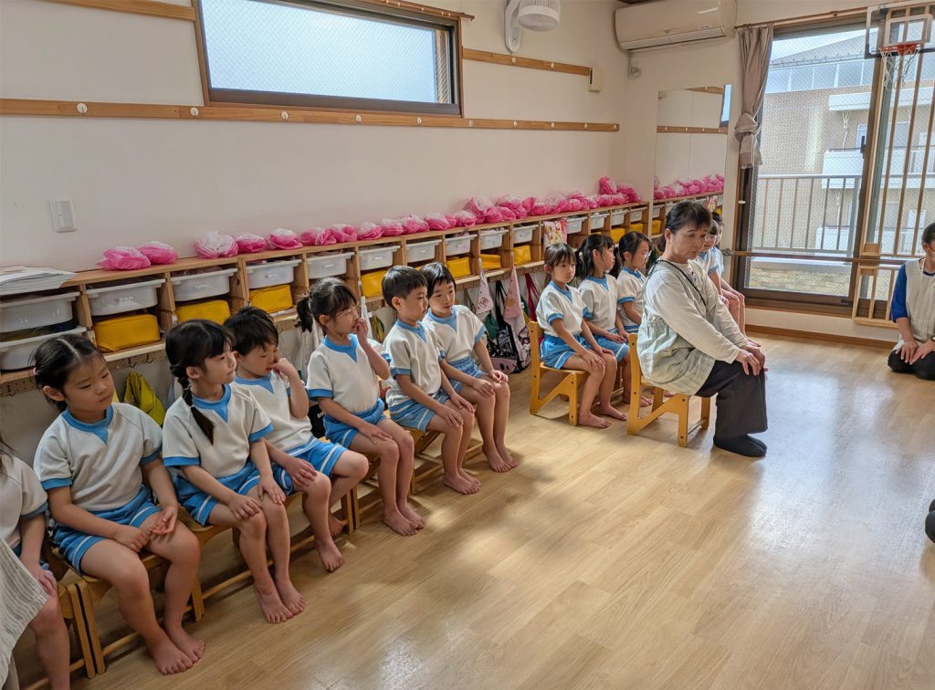 式当日の動きを練習するというだけでなく、これから各々違う小学校へ・・・その様なお話が保育者からあるため、いつもの笑顔では無く、神妙な面持ち。画像には写っていませんが対面に座っているぱんだ組さんも・・・。