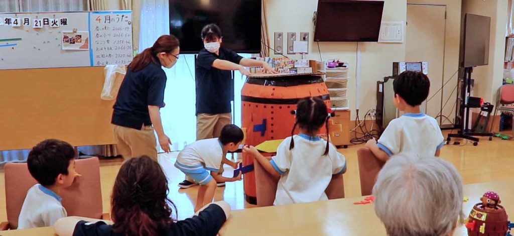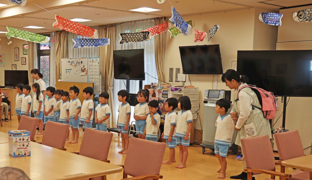 後からキリン組さんに聞いた話ですが、「あんなに広い所だと思ってなかった。」「たくさん人がいた。」とか・・・。みんなの想像をちょっと超えていたようです。「おかあさん」「めだかの学校」「こいのぼり」などの歌をお届けいたしました。